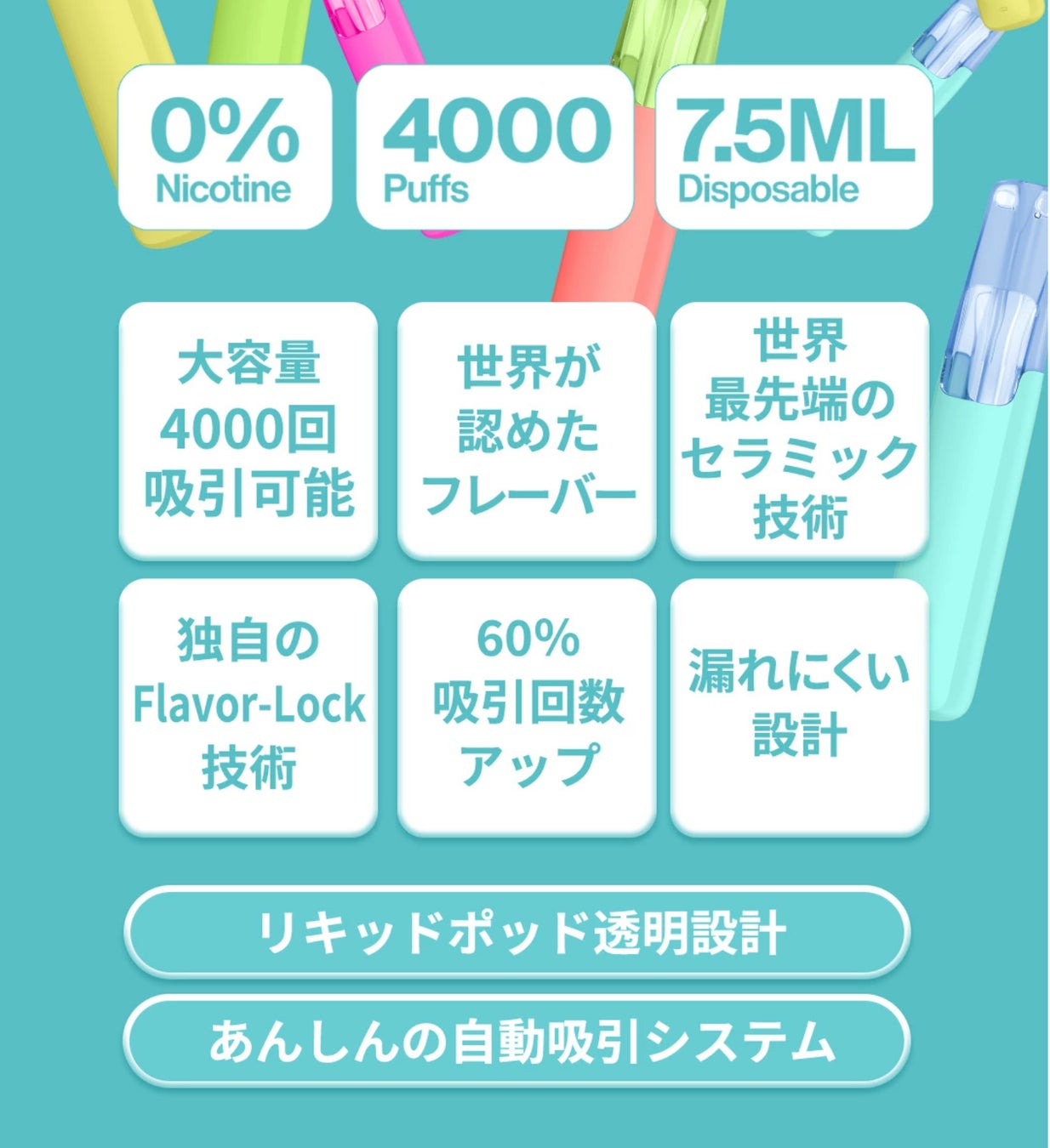 フレーバー:全6種(ウォーターメロンアイス、レモンパイナップル、ジャスミングリーンティー、メンソールプラス、レッドワイン(グレープ)、レモンライム)