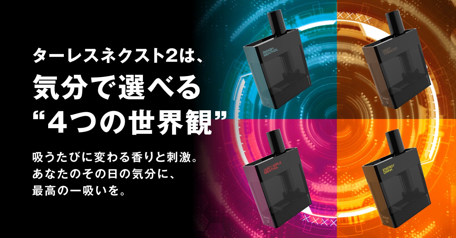 喫煙者の方に人気の(1) メンソール系・(2) タバコ系フレーバー、喫煙者の方にも非喫煙者の方にもお楽しみいただける(3) フルーツメンソール系・(4) ドリンク系フレーバーの幅広い4つの世界観を1つのデバイスでお楽しみ頂けます。